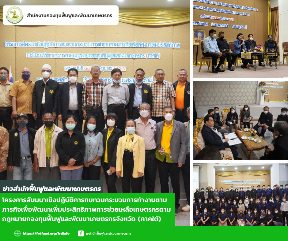 โดยนาย วิญญู สะตะ ผู้อำนวยการสำนักฟื้นฟูและพัฒนาเกษตรกร มอบหมายให้ นางโสมสุดา โพธิ์อินทร์ รองผู้อำนวยการสำนักฟื้นฟูและพัฒนาเกษตรกร เป็นผู้อธิบายงานของสำนักฟื้นฟูและพัฒนาเกษตรกร นางพาขวัญ พวงมาลี หัวหน้าส่วนส่งเสริมการฟื้นฟูและพัฒนาเกษตรกร ภูมิภาคที่ 4 นางสาวมัลลิกา สะอาดแก้ว พนักงานอาวุโส และนายสรพงษ์ วัฒนขจร พนักงานทั่วไป เข้าร่วมสัมมนาเชิงปฏิบัติการทบทวนกระบวนการทำงานตามภารกิจเพื่อพัฒนาเพิ่มประสิทธิภาพการช่วยเหลือเกษตรกรตามกฎหมายกองทุนฟื้นฟูและพัฒนาเกษตรกรจังหวัด (ภาคใต้)